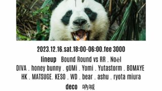 Events 2023-12-16 #outlazy1216 2nd anniversary x the year end x panda!? Open:18:00-6:00ADV:2,500yenDoor:3,000yenDJ:BoundRoundvsRR、Noёl、DIVA、honeybunny、gUMi、Yomi、Yutastorm、BOMAYE、MATSUGE、KESO、H... 2023.12.16 Events
